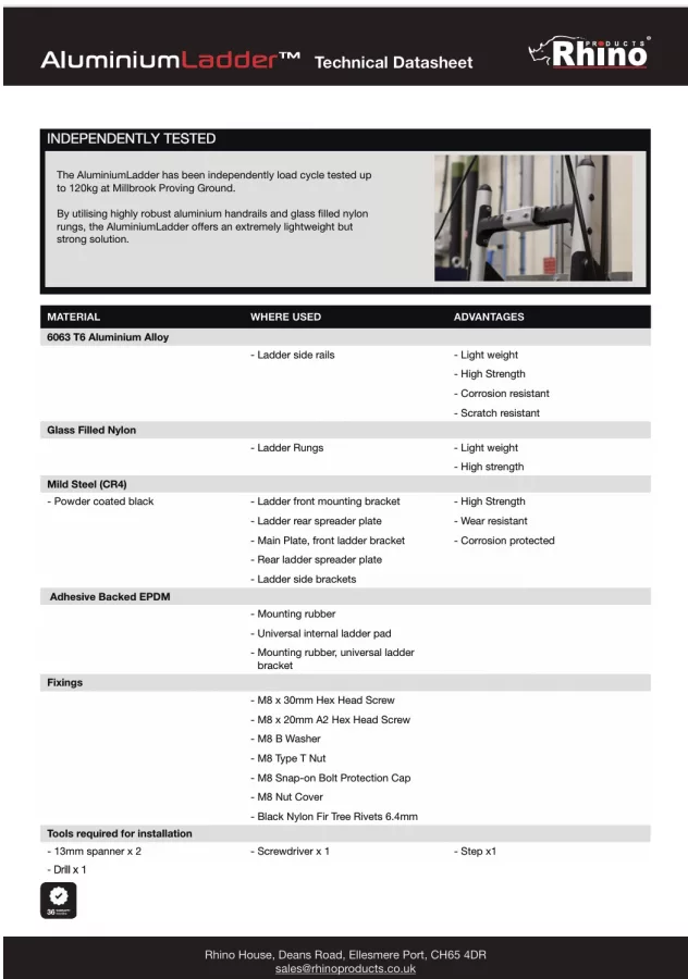 - Supplied as either a 6, 7 or 8 Step ladder as detailed in the Rhino Products application guide for the van models specific roof height.
